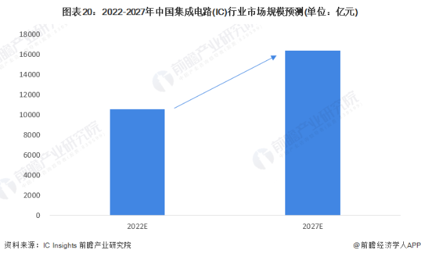 根据IC Insights的预测,预计中国集成电路市场规模2020-2025年年复合增长率为9.2%,其中中国国产芯片占比预计将从2020年的15.9%提升至2025年的19.4%,综合考虑IC Insights的预测和中国集成电路行业发展态势,初步测算,2027年,中国集成电路市场规模约为16384亿元。