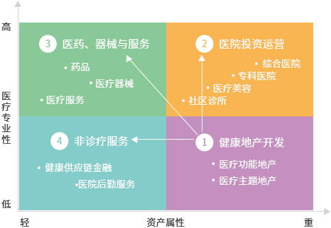 地产商转型医疗大健康,首先考虑协同性较高的业务,如医疗地产开发和医院投资等重资产属性且开发利润高的领域。