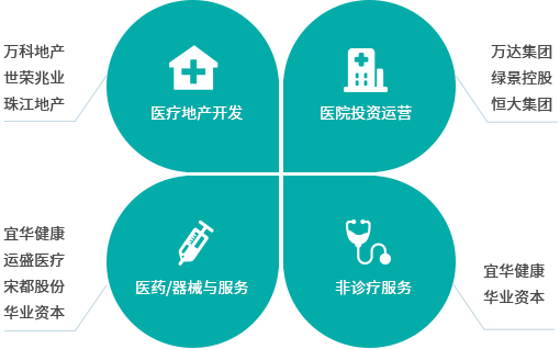 收购、参股、自建 医疗后勤、医院管理、专科医疗、医疗器械、高端养老、远程医疗 产业投资商+开发商+运营商 互联网医疗平台、养老公寓、综合性医院 投资收益、物业租售收益、运营收益等