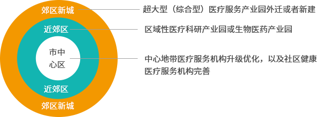 • 郊区新城:跨区域服务,健康服务产业园、医疗小镇等;