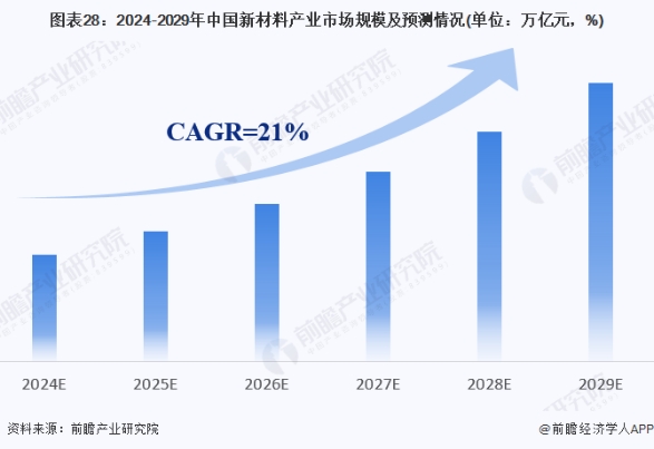 经过几十年发展,我国高性能材料行业在产业规模、技术进步和体系建设等方面取得明显成就,为国民经济和国防建设做出了重大贡献具备了良好的发展基础。同时随着中国制造业高质量发展加速,市场对于高端产品的需求更加迫切,特别是新能源、高端装备、电子信息等新兴领域对新材料的拉动作用明显。预测2024-2029年年均复合增长率约为21%。