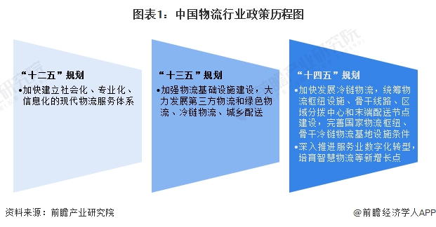 物流是跨部门和跨行业的复合型服务产业,是国民经济的重要组成部分。“十二五”时期,加快建立社会化、专业化、信息化的现代物流服务体系是主要工作内容;“十三五”时期,行业的发展重点是基础设施建设及第三方物流、绿色物流、冷链物流等细分领域;“十四五”时期,物流枢纽基础设施建设和智慧物流为重点规划发展方向。