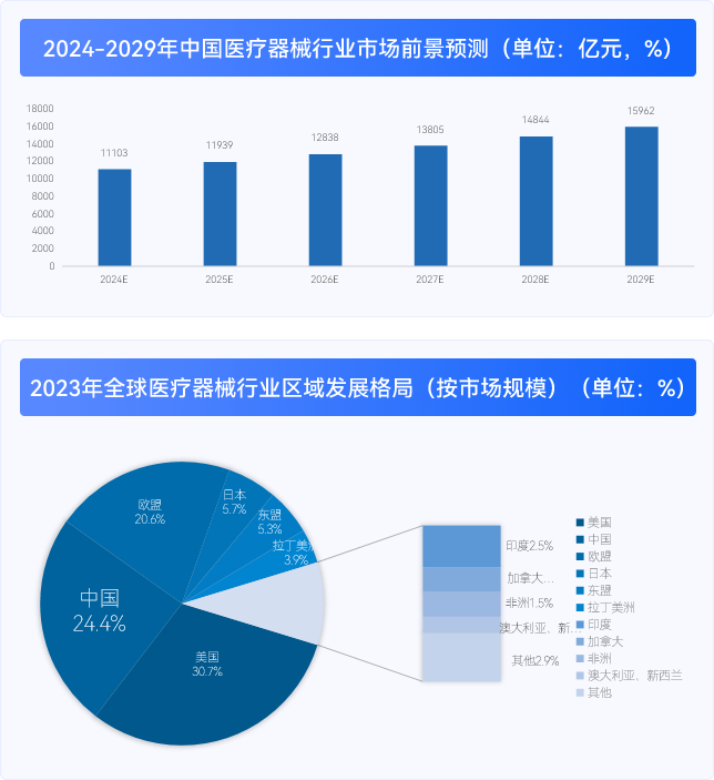 疗器械行业是中国国民经济发展的重要组成部分,其与中国宏观经济发展息息相关,未来随着中国医疗体系的不断发展,医疗器械行业市场规?;蚪中仙?。前瞻估测2029年中国医疗器械行业市场规模或将突破1.5万亿元,2023-2029年复合增长率达到7.53%。