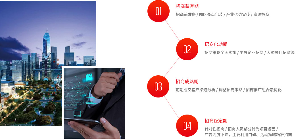 产业园区招商具有统一的筹划,具有全局性和连续性,整个招商工作可以分为四个阶段。